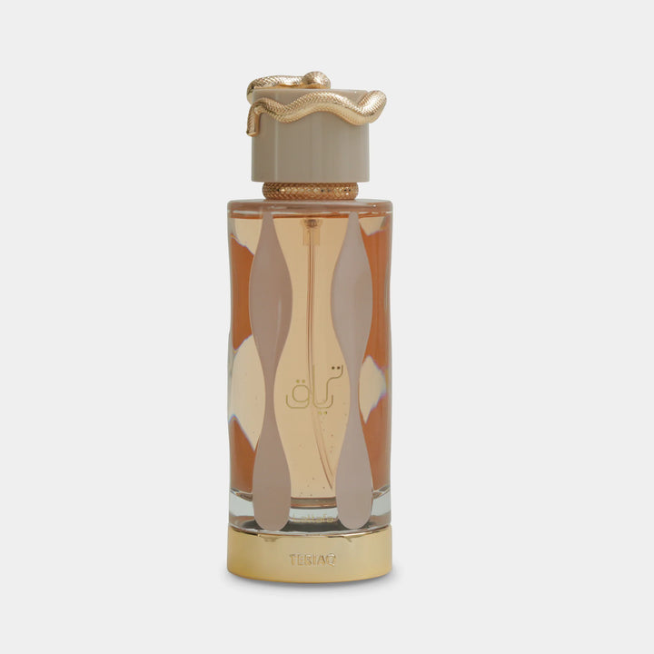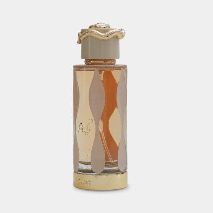 Lattafa Teriaq is a rich and intoxicating fragrance that weaves sweet indulgence with dark sophistication, creating an unforgettable olfactory experience. It opens with a bold and playful blend of pink pepper, caramel, bitter almond, and apricot—a dazzling contrast of spicy warmth, creamy sweetness, and juicy fruitiness that instantly captivates. The heart of the fragrance reveals a lush floral-gourmand composition. Honey drizzles over delicate white flowers, rhubarb, and romantic rose, delivering a seductive mix of sweetness and floral elegance, with a tangy twist from the rhubarb that adds depth and intrigue. As it dries down, Teriaq becomes deeply sensual and warm. The base features smooth vanilla, smoky leather, rich labdanum, and earthy vetiver, anchored by a soft touch of musk. This lingering finish is both comforting and powerful, wrapping the skin in a warm, resinous embrace with a hint of animalic allure.