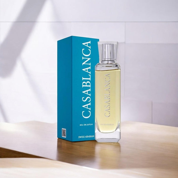 Swiss Arabian Casablanca is a warm, addictive fragrance that blends fruity sweetness with smooth, sensual depth. It opens with a juicy burst of apple and grapes, creating a vibrant and mouthwatering introduction that’s instantly inviting. The heart is centered on earthy patchouli, adding a touch of depth and balance to the sweetness, giving the fragrance a refined and grounded character. As it settles, the base unfolds into a luxurious blend of musk, amber, pear, caramel, and suede.